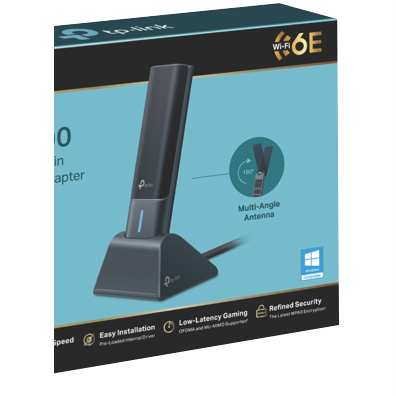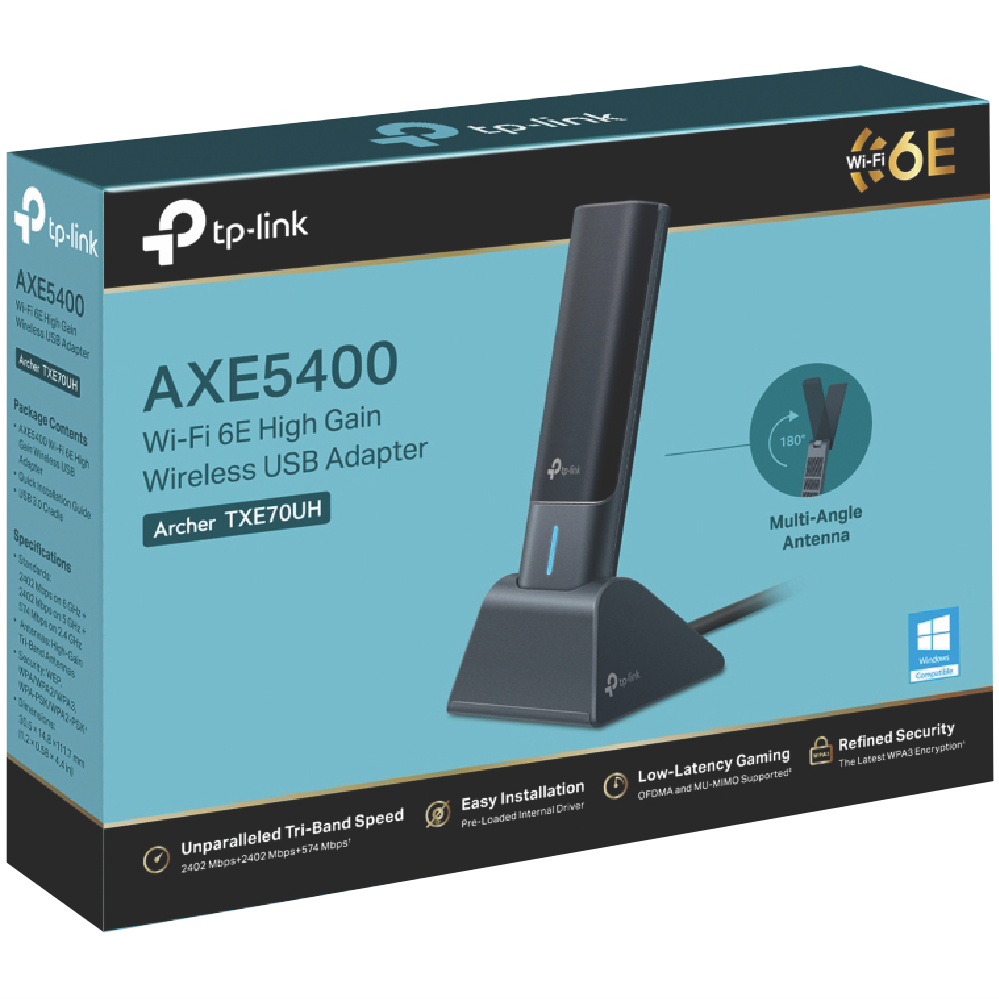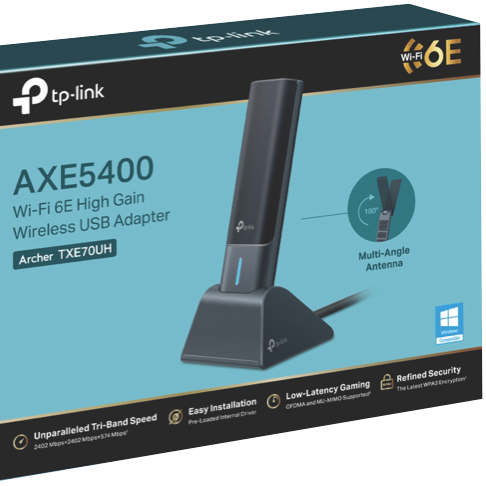 Step into the future of high-speed Wi-Fi with the TP-LINK AXE5400 Wi-Fi 6E High Gain Wireless USB Adapter. This powerful USB adapter unlocks the potential of Wi-Fi 6E delivering blazing multi-gigabit speeds expanded capacity and reduced latency. Its high-gain design ensures you get the most out of Wi-Fi 6E connections blanketing your home with strong reliable signal. Simplify your network setup - just plug into any USB 3.0 port on your Windows 10 or 11 PC to establish an ultrafast wireless link. With advanced security protocols like WPA3 and beamforming technology to find the best signal path the AXE5400 puts complete confidence in your wireless performance. Manufacturer Part Number ARCHER-TXE70UH. Backed by a 3 year warranty from TP-LINK.