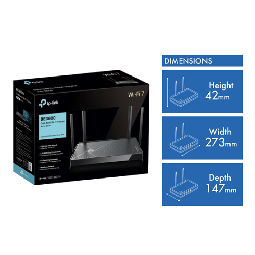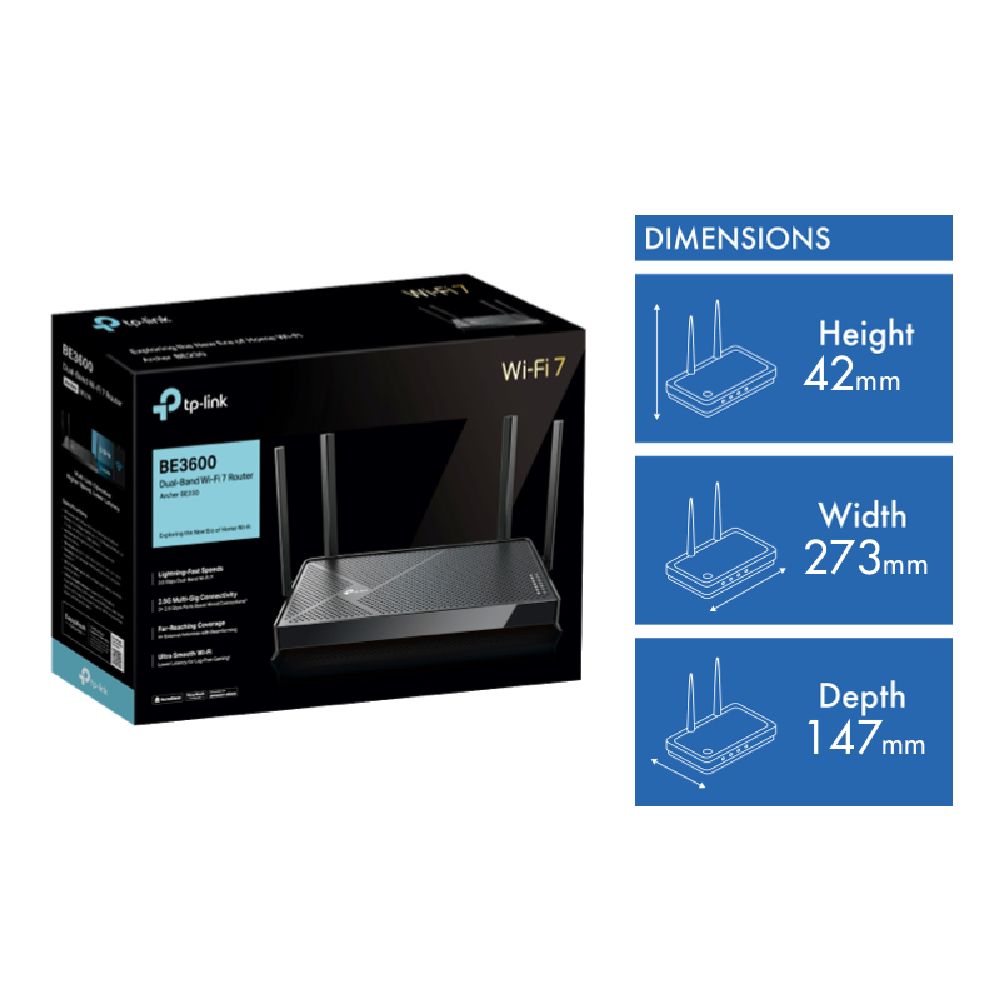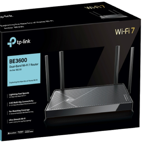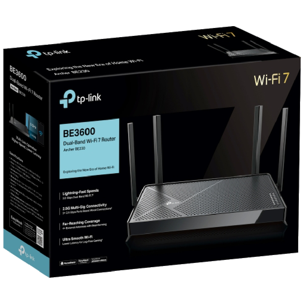 Step into the future of home networking with the TP-LINK BE3600 Dual-Band Wi-Fi 7 Router. This sleek black router delivers blazing-fast speeds of up to 3.6 Gbps across dual bands - 2882 Mbps on 5 GHz and 688 Mbps on 2.4 GHz. The four external antennas provide reliable coverage throughout your home while the router's smart band allocation feature automatically assigns devices to different bands for the best performance. Connectivity is sorted with one WAN port four LAN ports and a USB 3.0 port for sharing files or printers. Your network stays secure thanks to SPI firewall protection access control and IP & MAC binding. Setting up is straightforward with the included quick installation guide and RJ45 ethernet cable. The ARCHER-BE230 comes with a reassuring 3-year manufacturer's warranty for peace of mind.