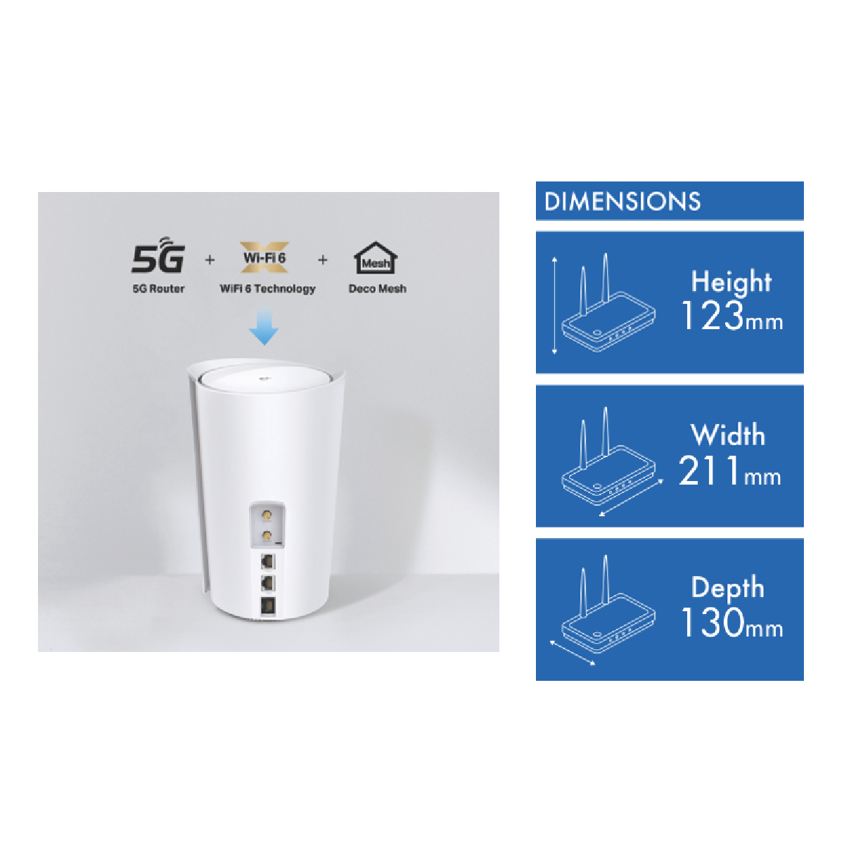 Enhance your home's wireless connection with the TP-LINK Deco 5G AX3000 Whole Home Mesh Wi-Fi 6 Gateway. This sleek white mesh system blankets your home in fast reliable Wi-Fi 6 coverage up to 5500 square feet. By distributing devices across dual bands the Deco optimizes performance for smooth 4K streaming gaming working from home and more. Four internal LTE/5G antennas plus two Wi-Fi antennas inside pair with two external antennas to strengthen signal penetration. 1x 2.5 Gigabit and 2x Gigabit Ethernet ports allow flexibility in connecting wired devices. Manage your network with ease through the intuitive Deco app. At just 123mm tall and 210.5mm wide Deco 5G's compact footprint fits into any living space. Enjoy the convenience of AI-driven parental controls guest access and more. Backed by TP-Link's 3 year warranty the Deco 5G AX3000 Whole Home Mesh Wi-Fi 6 Gateway brings you the future of Wi-Fi today.