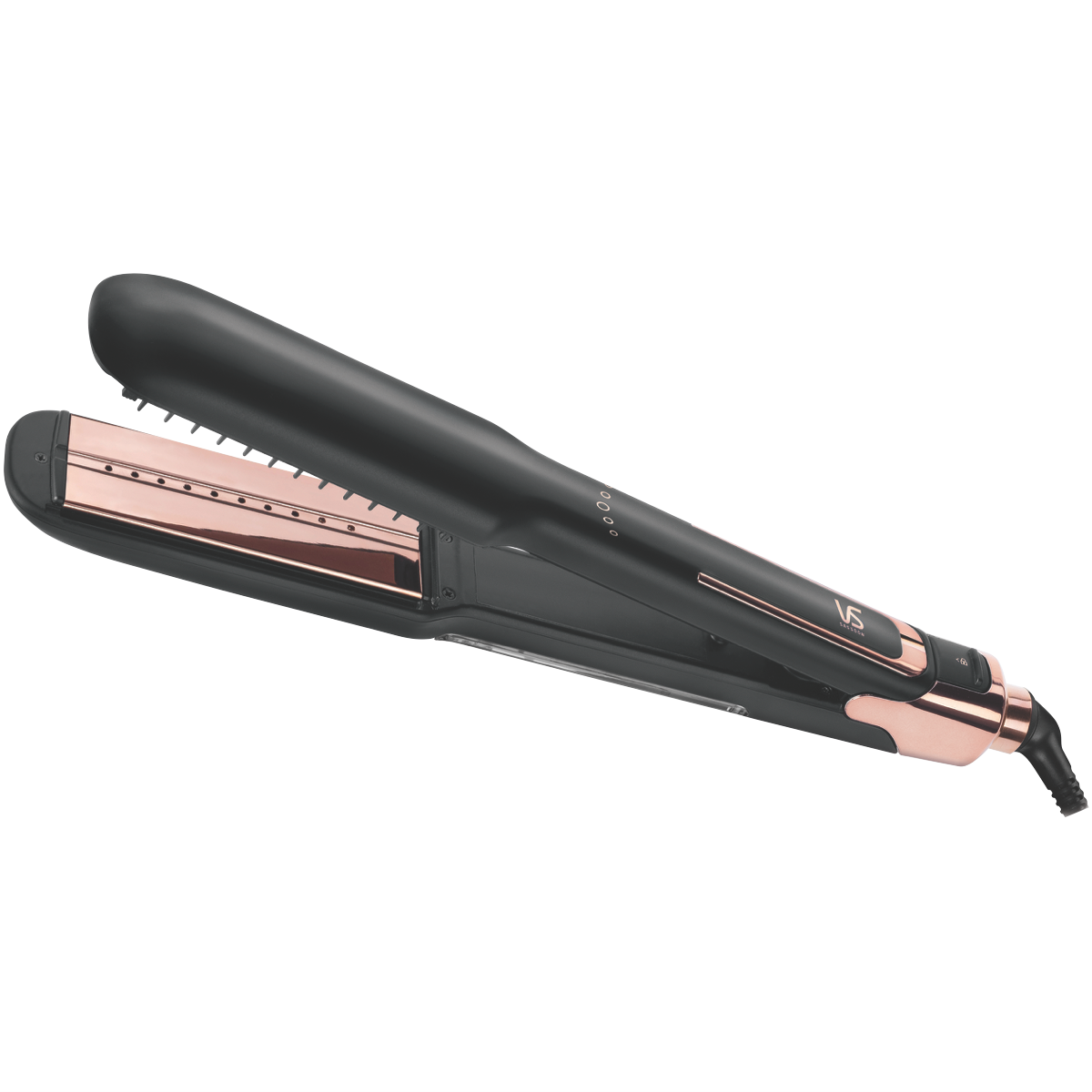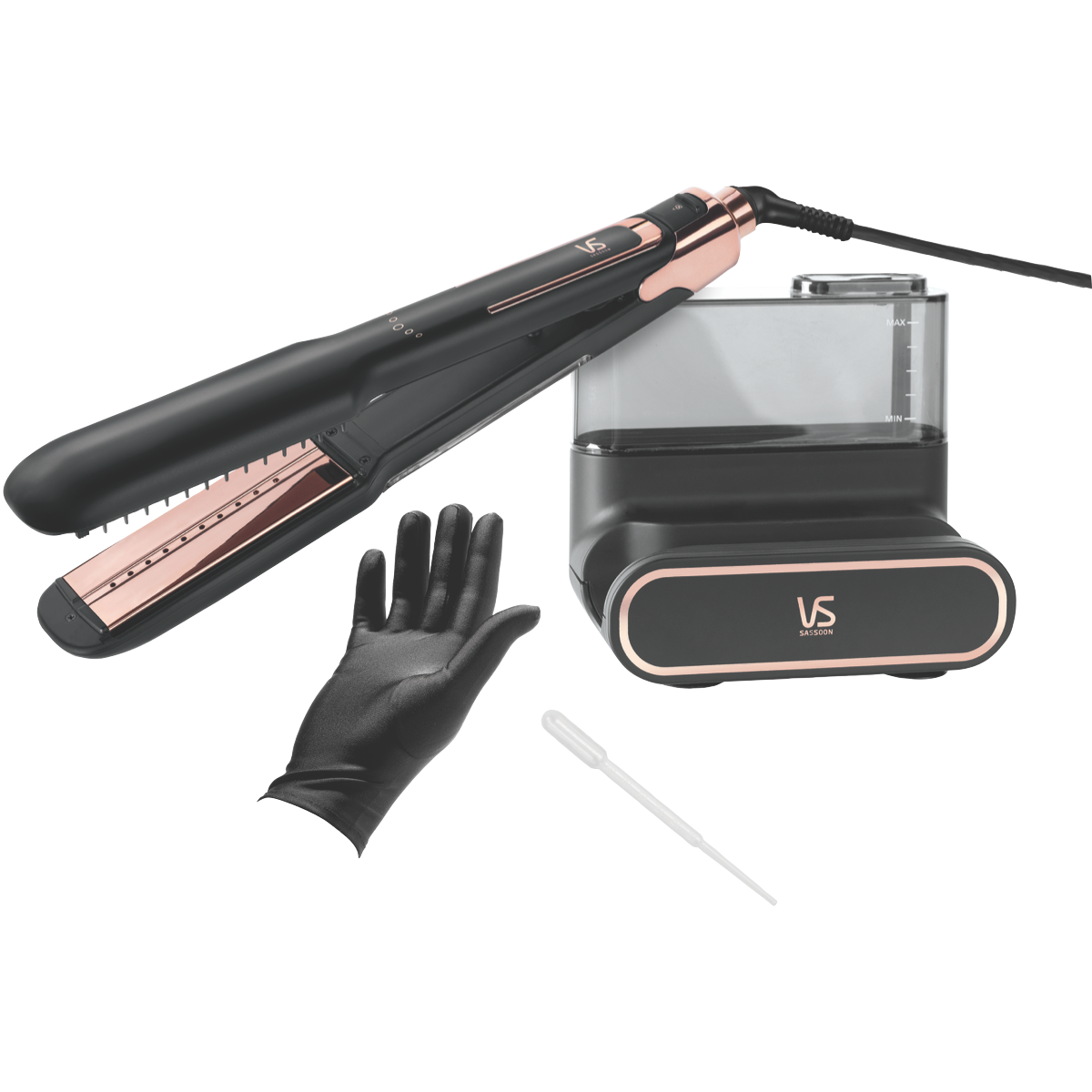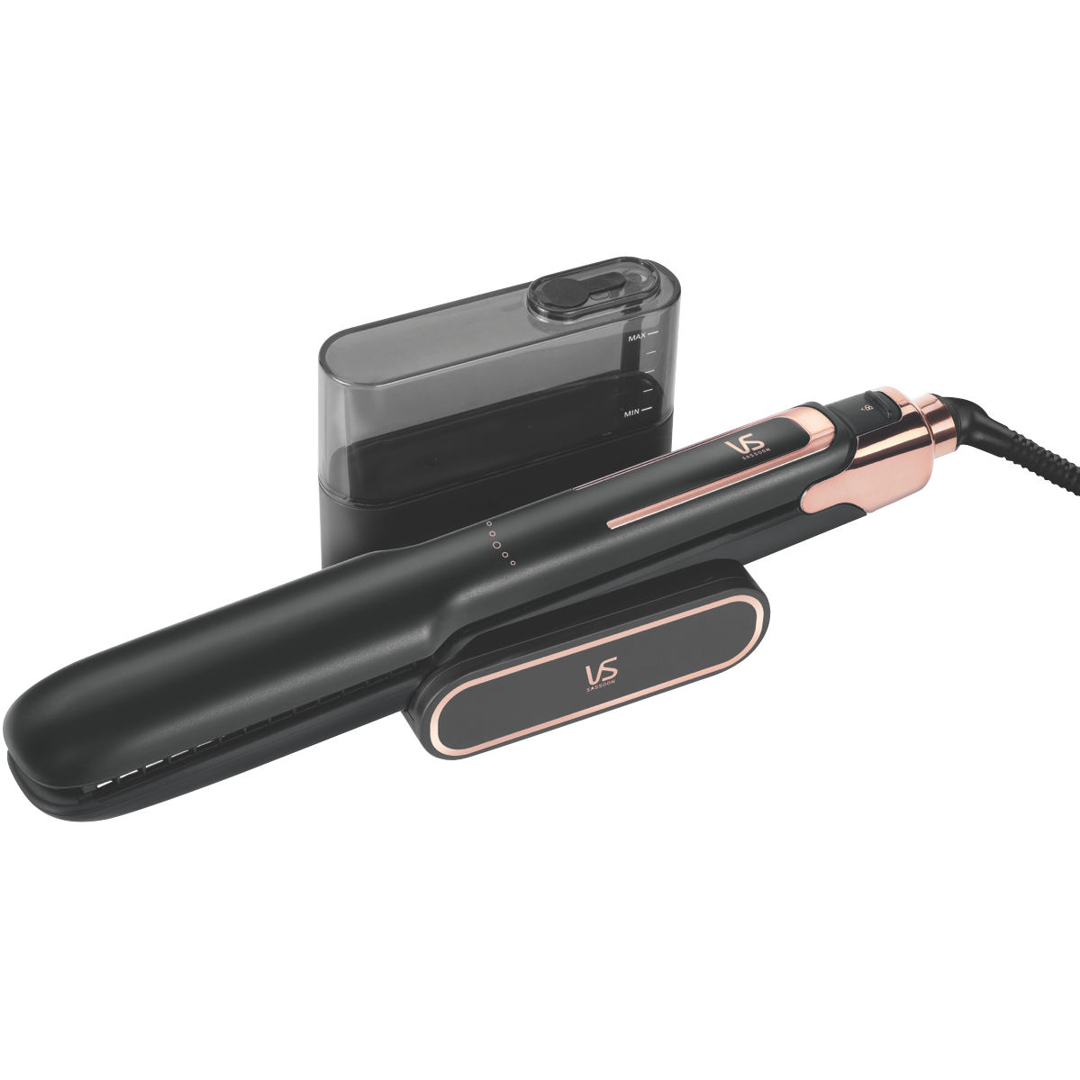 Transform your hair styling routine with the innovative VS Sassoon Steam Straight Brilliance. This sleek black and gold straightener harnesses the power of steam to deliver smoother shinier hair. The titanium-infused plates glide effortlessly through all hair types while providing even heat distribution. With 5 adjustable temperature settings up to 220°C you can tailor the heat to suit your hair needs. The 105mm x 36mm flexible titanium cushion plates straighten hair quickly while minimizing damage. Safety is a priority with auto shut-off kicking in after 72 minutes of inactivity. Refill the built-in water reservoir directly or use the base station for gravity refilling on the go. To protect your hands a universal heat glove is included. Backed by a 3 year warranty this straightener is built to last. For salon-quality results at home choose the VS Sassoon Steam Straight Brilliance. The manufacturer's part number for this product is VSS9900A. Discover the brilliant power of steam today.