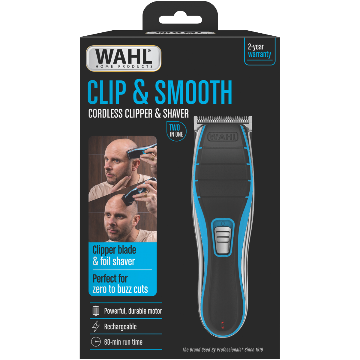 Tired of switching between clippers and shavers? The Wahl Clip and Smooth Clipper and Shaver has you covered. This versatile 2-in-1 tool specializes in all clipper cuts from skin to No 4 haircuts. With 6 reinforced guide combs you can achieve your desired look effortlessly. The foil shaver head features a 3 Cut System for a smooth finish. Cordless convenience lets you trim and shave anywhere with 1 hour of runtime from a full charge. You'll also get a storage pouch styling comb scissors blade guard cleaning brush blade oil and charger. Part number 3025016. 2-year manufacturer's warranty included.