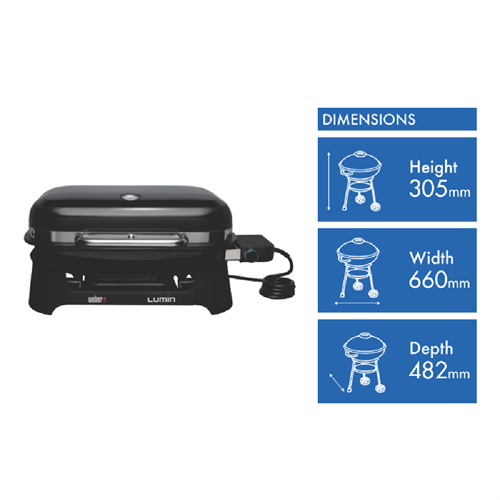 Want to take your barbecuing to the next level? The Weber Lumin Electric Barbecue is the perfect choice for anyone looking for a convenient and easy-to-use grill. This sleek black barbecue packs a punch with its 2300-watt power giving you plenty of heat to cook up all your favorite meals. Measuring just 305x660x485mm and weighing only 16.5kg it's compact enough to fit in any outdoor space. Plus you can customize your setup with compatible accessories like the WeberLumin Premium Bonnet Cover Griddle and Stand with Side Table. Get ready to impress your friends and family with delicious grilled dishes all thanks to the Weber Lumin Electric Barbecue (92010924).
