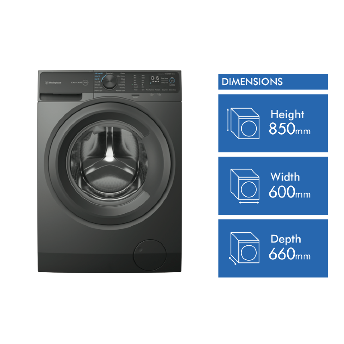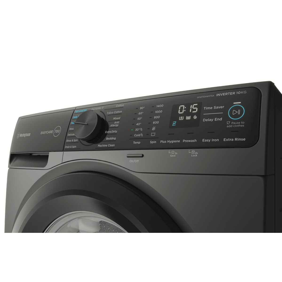 This Westinghouse 10kg front load washing machine offers powerful and efficient performance for busy families. With a generous 10kg capacity the WWF1044M7SA makes light work of large loads. The 1400rpm maximum spin speed means less time hanging clothes out to dry. And a 4.5 star WELS water rating plus 5 star energy rating mean you'll save water and power. The 15 versatile wash programs on this metallic grey EasyCare model take care of everything from machine cleaning to anti-allergy and delicate fabrics. Options like Vapour Extra Rinse and Delay End give you extra control. While the easy-access front loader design is gentle on clothes. From school uniforms to bedding the Westinghouse WWF1044M7SA washing machine quietly and efficiently washes for years to come. It features a two year manufacturer's warranty for peace of mind. The manufacturer's part number for this product is WWF1044M7SA. Shop now for an eco-friendly laundry solution.
