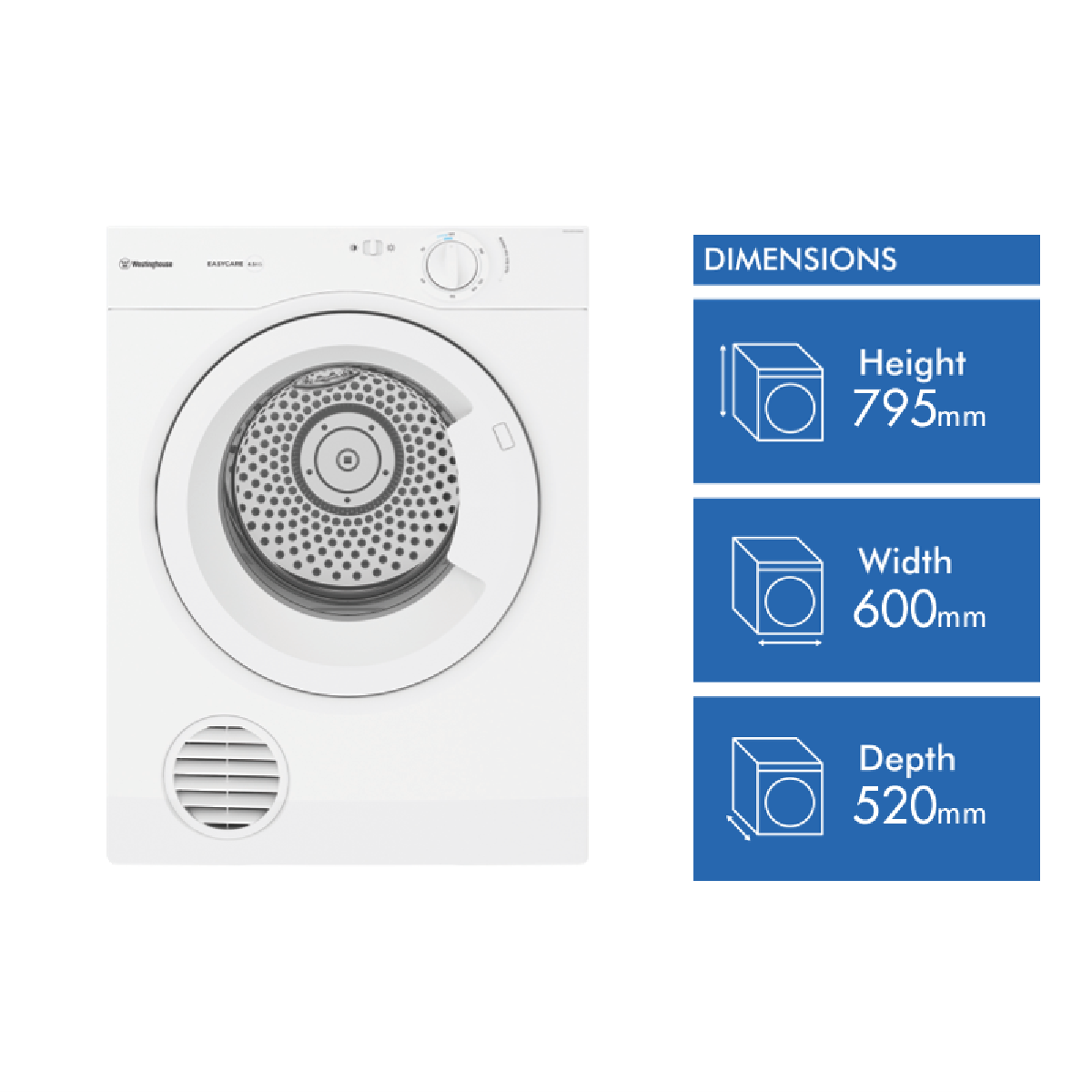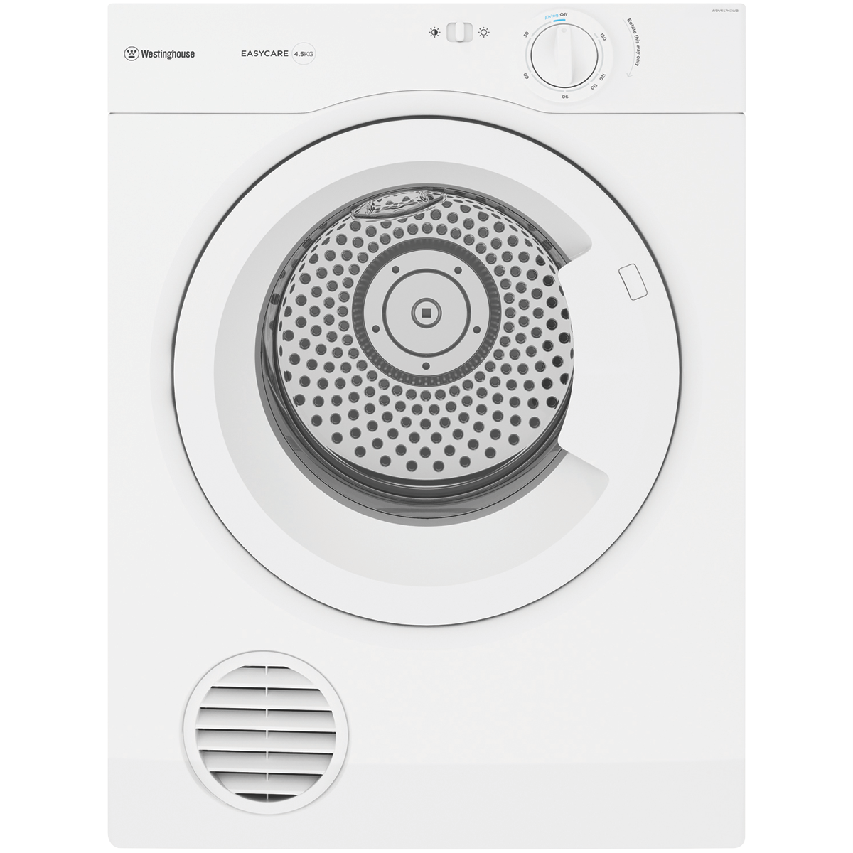 This Westinghouse 4.5kg vented clothes dryer is the efficient solution for your small laundry loads. With a compact 600mm width 795mm height and 520mm depth it mounts discreetly on any wall to maximize space savings in tight areas. The white finish blends into any decor. Warm and hot temperature settings timed drying programs and a reverse tumbling action provide customized drying for all fabrics. An automatic cool down and child safety lock add extra convenience and peace of mind. The vented drying system efficiently removes moisture. Wall mounting hardware flexible venting options and a 2 year manufacturer's warranty round out the package. For maximum efficiency and space savings when drying small loads this Westinghouse vented dryer is the ideal choice. The manufacturer's part number for this product is WDV457H3WB. Check it out today to transform your laundry.