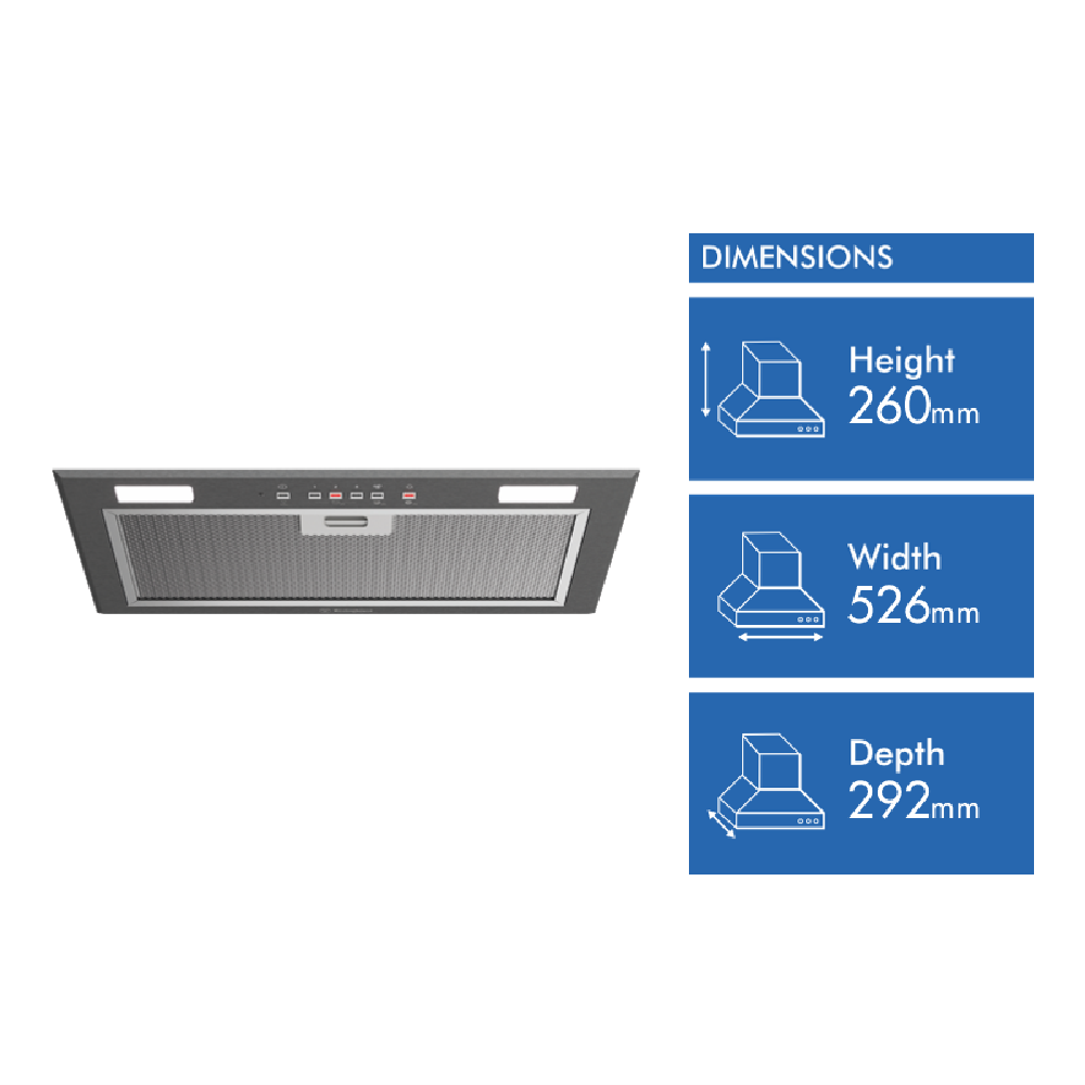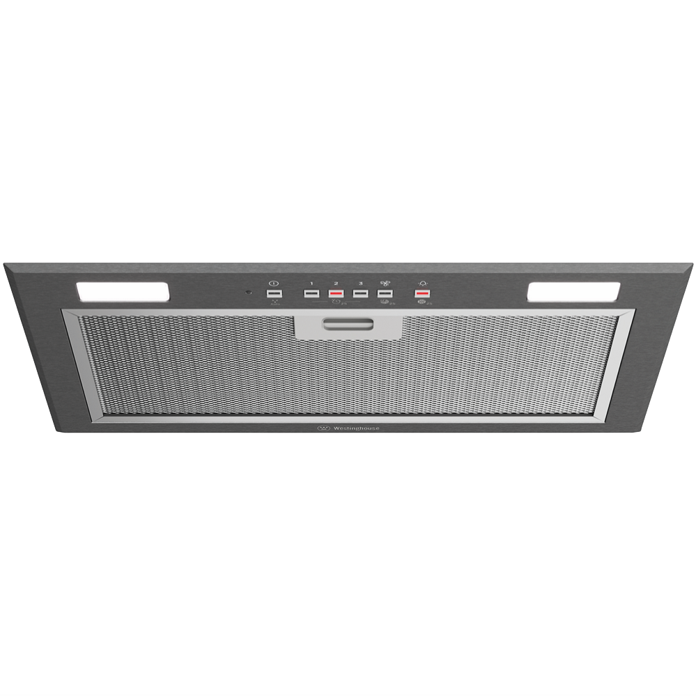 Bring sleek modern style to your kitchen with the Westinghouse 52cm Integrated Rangehood. This integrated rangehood features a dark stainless steel finish that will complement any contemporary decor. With powerful 800m3/hr extraction and 3 fan speeds this rangehood efficiently clears steam grease and odours from the air when cooking. The tangential motor operates quietly at 67 decibels while the LED lights illuminate your cooktop for clearer visibility. Designed for ducted or recirculating installation this integrated rangehood includes multilayer aluminum micromesh filters that are easy to remove and clean. The push button controls and clean filter indicator add convenience and the auto thermal cutout safety switch provides peace of mind. Measuring 526mm in width 249mm in height and 292mm in depth this rangehood will fit 52cm spaces above stoves and cooktops. Integrated rangehoods like this Westinghouse model deliver robust ventilation without interrupting your kitchen's seamless aesthetic.With a 2 year manufacturer's warranty the Westinghouse 52cm Integrated Rangehood provides powerful quiet performance to keep your kitchen fresh and clean during cooking. The manufacturer's part number for this product is WRI525BC.