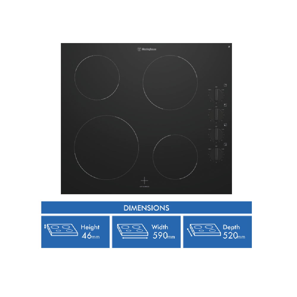 The minimalistic design of the Westinghouse 60cm Ceramic Cooktop WHC642BC offers function and simplicity to your kitchen. Four cooking zones with nine power levels to choose from gives you precise control over your cooking. Knob controls offer easy operation during operation and a sophisticated black ceramic glass finish adds a touch of style to your kitchen. This ceramic cooktop has an easy-to-clean surface that will simply wipe clean with a mild detergent and a damp cloth minimising your time spent in the kitchen.