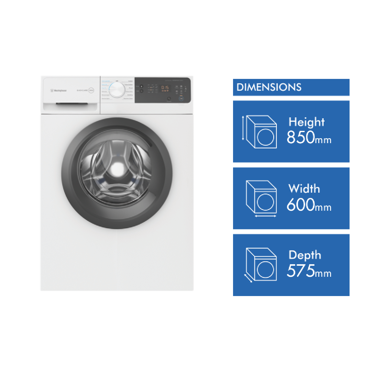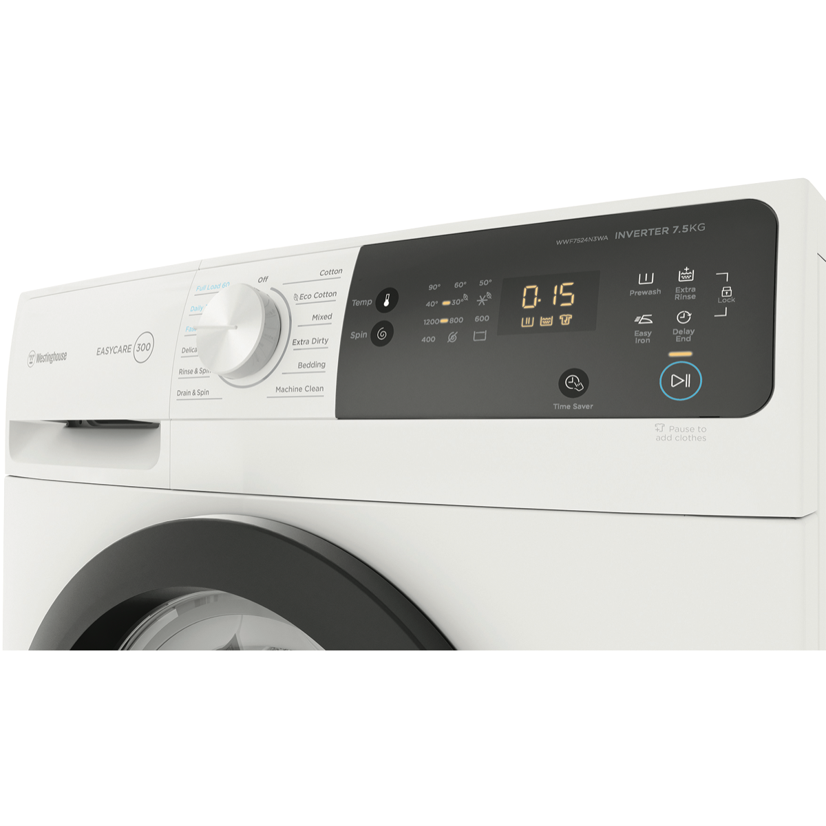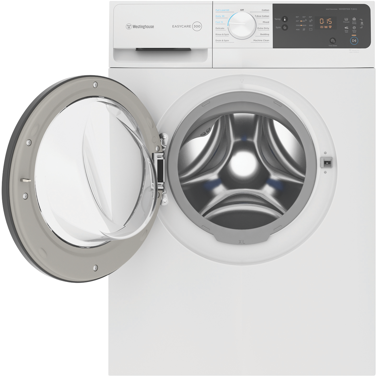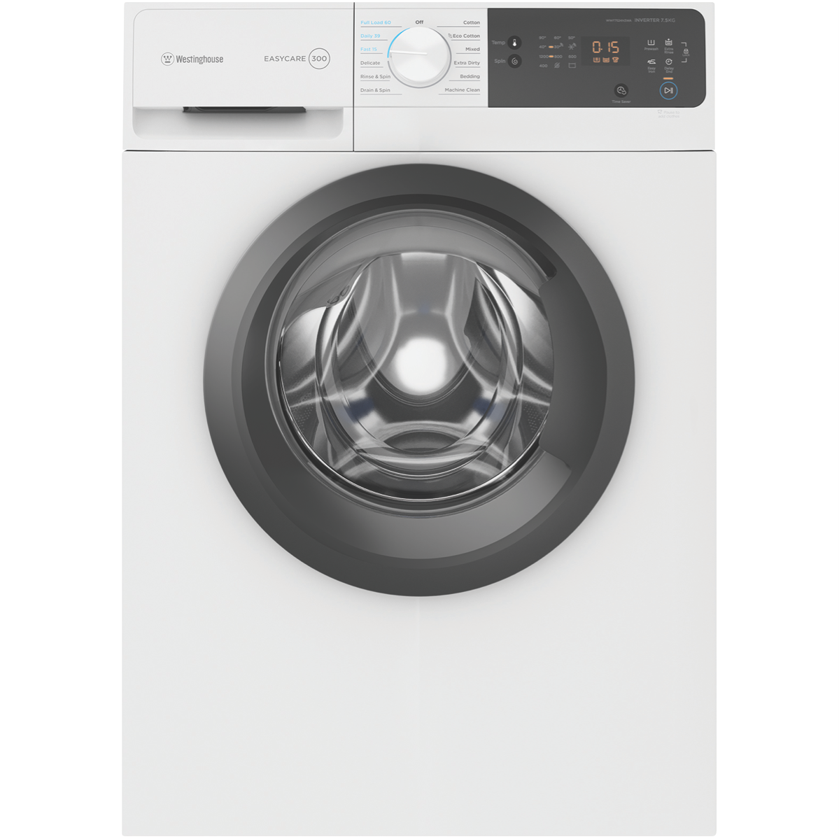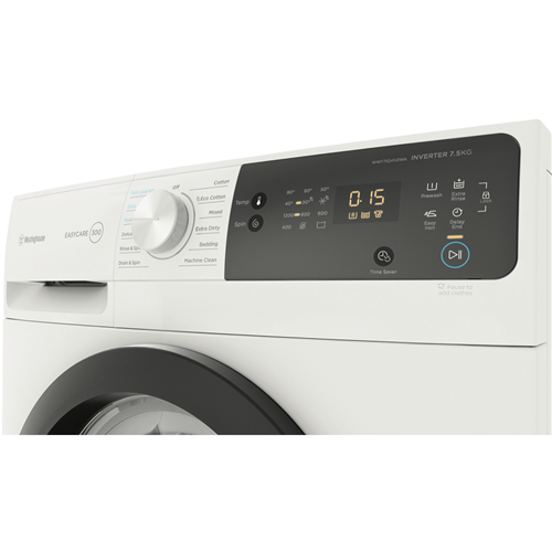 This white washing machine makes light work of all your clothing and linen needs for the whole family. With a generous 7.5kg washing capacity 12 diverse wash programs and a quick 15 minute FAST cycle this Westinghouse washer enables you to refresh clothes in a hurry or give heavily soiled items an intense clean. The range of wash settings include Delicate Bedding Drain & Spin Cotton Mixed Extra Dirty Machine Clean and Eco Cotton so you can select the ideal mode for each load. Additional handy features like the Delay End function let you schedule wash completion times to suit your lifestyle while the Add Clothes button provides the flexibility to throw in last minute items mid-cycle. An intuitive LED display with dial control makes operation straightforward. This front loader also boasts a high 1200RPM spin speed to reduce drying times. Rated an impressive 4 stars for water efficiency the washer uses an economical 76 litres per wash. With an energy rating of 3.5 stars the Westinghouse washer helps to save on running costs too. Covered by a 2 year warranty for peace of mind this quality washing machine will keep your laundry looking great for years to come. The manufacturer's part number for this product is WWF7524N3WA. Discover how this Westinghouse front load washer can make laundry simple today.