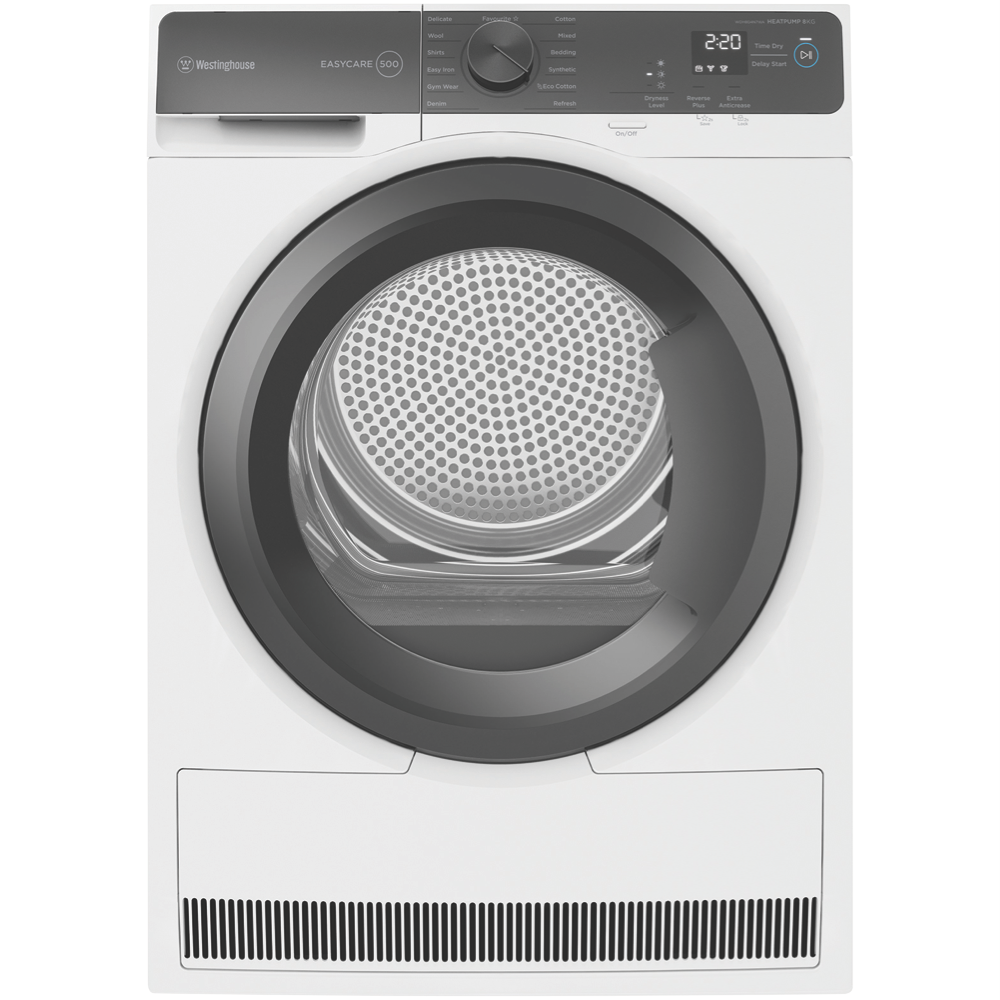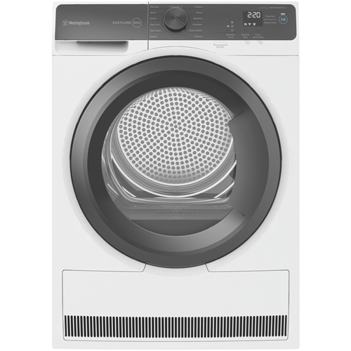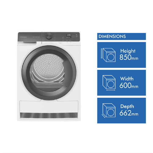 Cut your drying time and save with the Westinghouse 8kg Heat Pump Dryer. This energy-efficient clothes dryer features a large 8kg capacity to handle medium to large loads. The innovative heat pump technology gently dries clothes while using less energy compared to conventional dryers as evidenced by its impressive 7 star energy rating. Thirteen versatile drying programs allow you to customize cycles for all fabrics like cotton synthetics wool delicate items denim bedding and more. Options like the extra anti-crease setting reverse tumbling action auto cool down and delicates mode ensure your garments are dried and finished just right. With a sleek white finish this dryer blends seamlessly into any laundry. The easy-to-use rotary dial control and LCD display make operation a breeze. The sensor dry function automatically adjusts drying time and temperature for optimal results. At 600mm wide 850mm high and 662mm deep the dryer fits most laundry spaces. Plus the two year manufacturer's warranty provides added peace of mind. Give your laundry an energy-efficient upgrade with the Westinghouse Heat Pump Dryer. The manufacturer's part number for this product is WDH804N7WA.