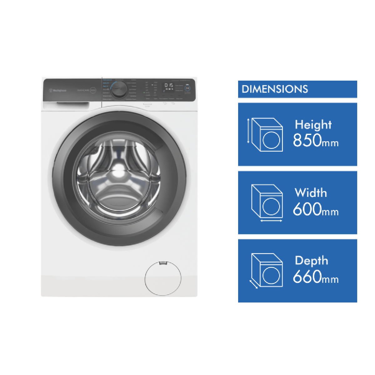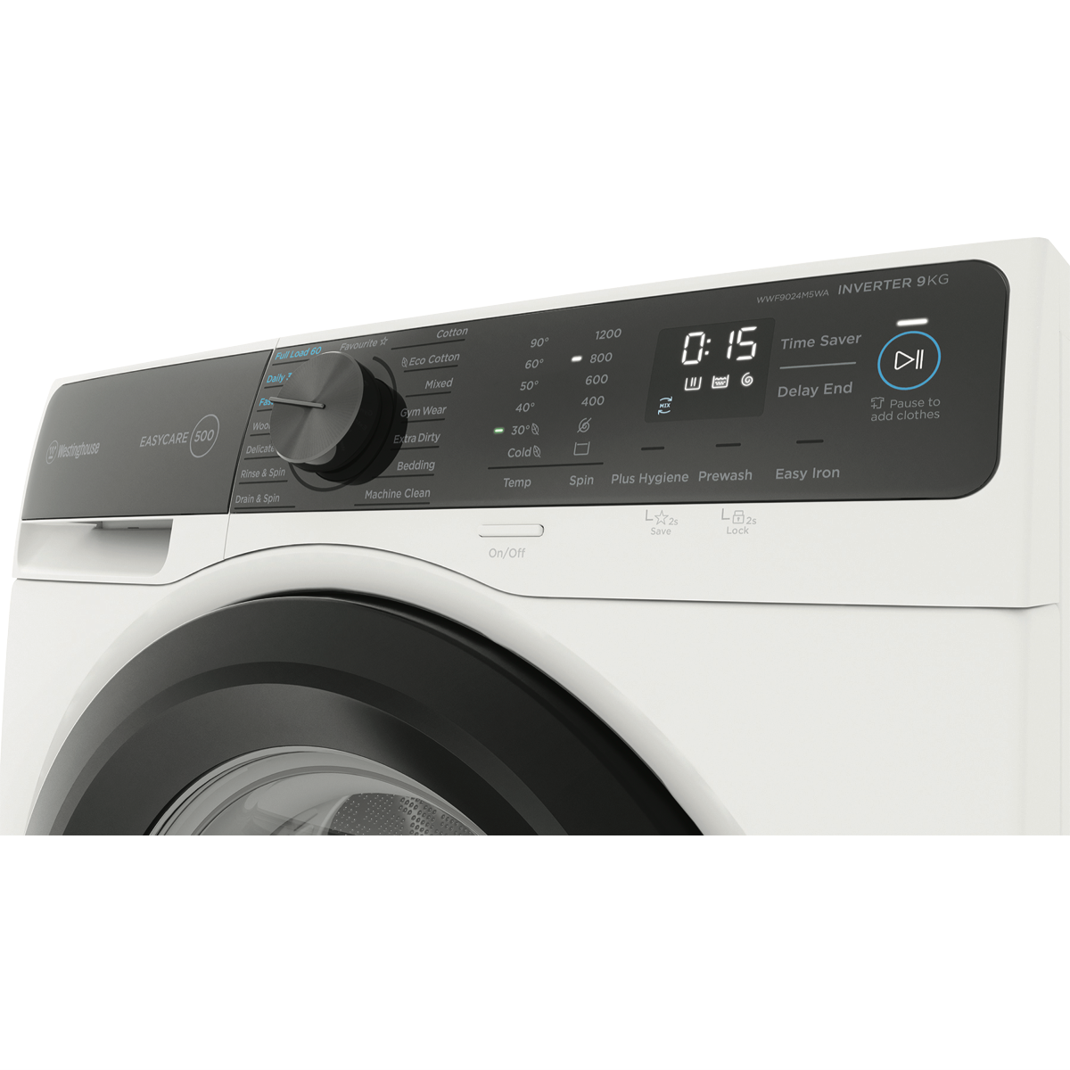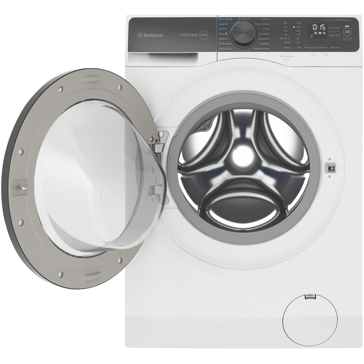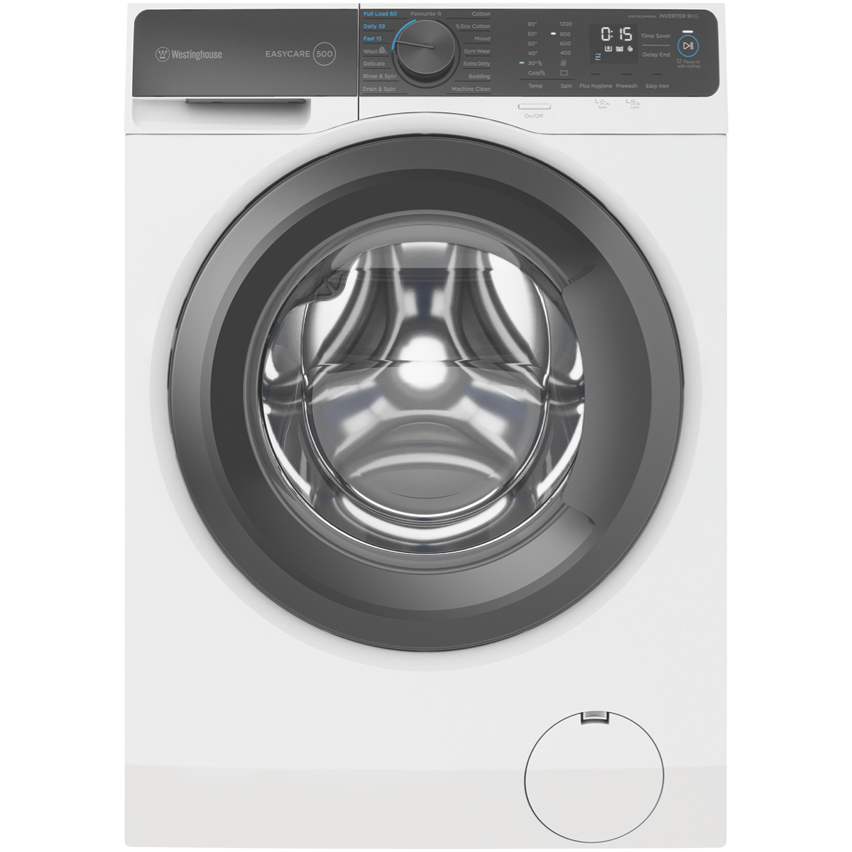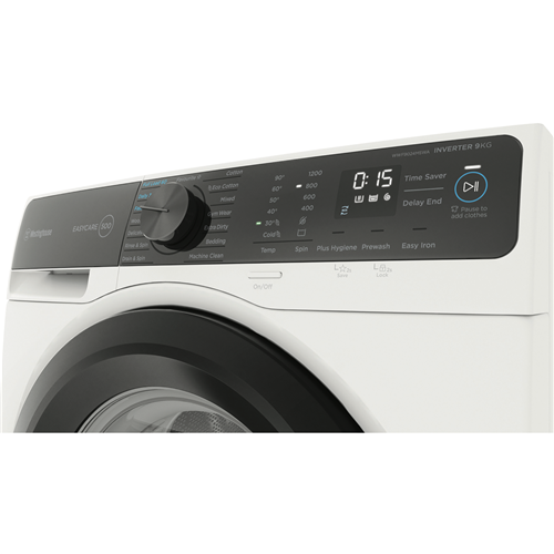 The sleek white Westinghouse EasyCare 9kg front-loading washing machine delivers powerful cleaning performance for your laundry needs. With a 4-star energy rating and 4-star water rating this washing machine is designed for efficient operation. The large 9kg capacity enables you to wash more in each load saving you time and energy. Choose from 15 diverse wash programs like Mixed Delicate and Eco Cotton to handle every fabric type with care. The quick 15 minute Fast program lets you speed through smaller loads when you're pressed for time. For tough stains turn to the robust Extra Dirty cycle that tackles even the most stubborn dirt. The intuitive control panel with electronic touch buttons makes operation a breeze. With convenient features like Delay End Add Clothes and Child Lock you stay in control of each wash. Harnessing a powerful 1200 RPM maximum spin speed this washer removes more water from your clothes to cut down drying time. The stainless steel drum is gentle on fabrics while still giving a thorough clean. Backed by Westinghouse's 2 year warranty for added peace of mind. Give your laundry an efficient high performing clean with the Westinghouse EasyCare 9kg Front Load Washer. The manufacturer's part number for this product is WWF9024M5WA. Check out this washing machine today for your home.
