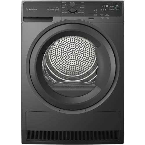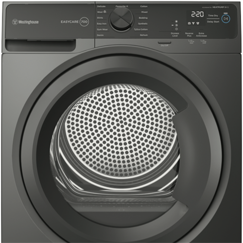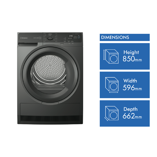 This 9kg Westinghouse Heat Pump Dryer offers efficient energy-saving performance with its 8 Star Energy Rating. The sensor dry technology monitors moisture levels automatically stopping when clothes are dry to prevent over-drying and save electricity. With 12 specialized drying programs like Cotton Synthetic Delicate Easy Iron Eco Cotton and Wool you can gently dry everything from everyday loads to special care items. The reverse tumbling action prevents tangling while the delicates setting ensures your fragile fabrics are dried with extra care. Other handy features include delay start internal drum light extra anti-crease and adjustable dryness levels so you get ideal results every time. This large capacity dryer can handle big loads up to 9kg perfect for busy families. Measuring 850mm high x 596mm wide x 662mm deep it has a stylish metallic grey finish to complement your laundry. The manufacturer's part number for this product is WDH904N7SA. With a 2 year warranty this Westinghouse heat pump clothes dryer offers smart sensor drying technology for efficient customized results on all your fabrics.