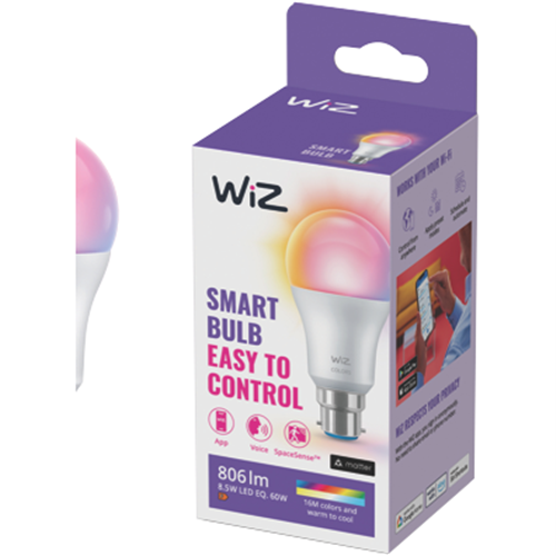 Transform your home lighting with this WiZ Colour A60 B22 Smart Bulb that fits standard bayonet sockets. It offers a full spectrum of colours and white tones from warm 2200K to cool 6500K plus RGB options so you can set the perfect mood for any occasion. With 806 lumens of brightness and a long 25000-hour lifetime this bulb will serve you for years to come. Connect it to your Wi-Fi network to control remotely or use voice commands through Google Assistant or Amazon Alexa. Comes with a 2-year warranty. Model WIZWCAB22A60BTP.