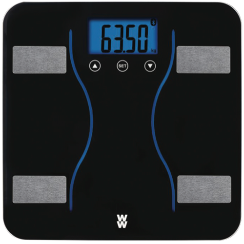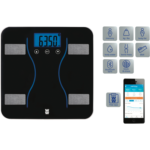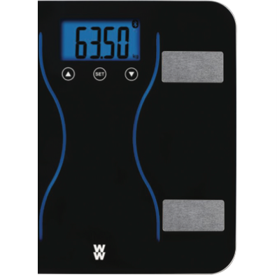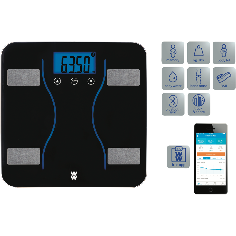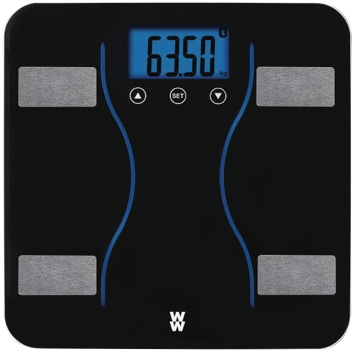 Step on the WW Body Analysis Bluetooth Diagnostic Scale and unlock a wealth of insights into your health. With its sleek black tempered glass construction this smart scale provides 10 user profiles and seamlessly syncs your weight body fat body water BMI and other metrics via Bluetooth to your iOS or Android device. By tracking your progress over time this scale helps you meet your goals whether that's losing fat gaining muscle or maintaining your weight. The 4.8cm digital readout with blue backlit display ensures easy visibility while the 182kg weight capacity provides durability and stability for users of all sizes. With a 10 year manufacturer's warranty this scale is built to last. The manufacturer's part number for this product is WW310A. Monitor your health and stay on track with your fitness objectives with this innovative Bluetooth scale..