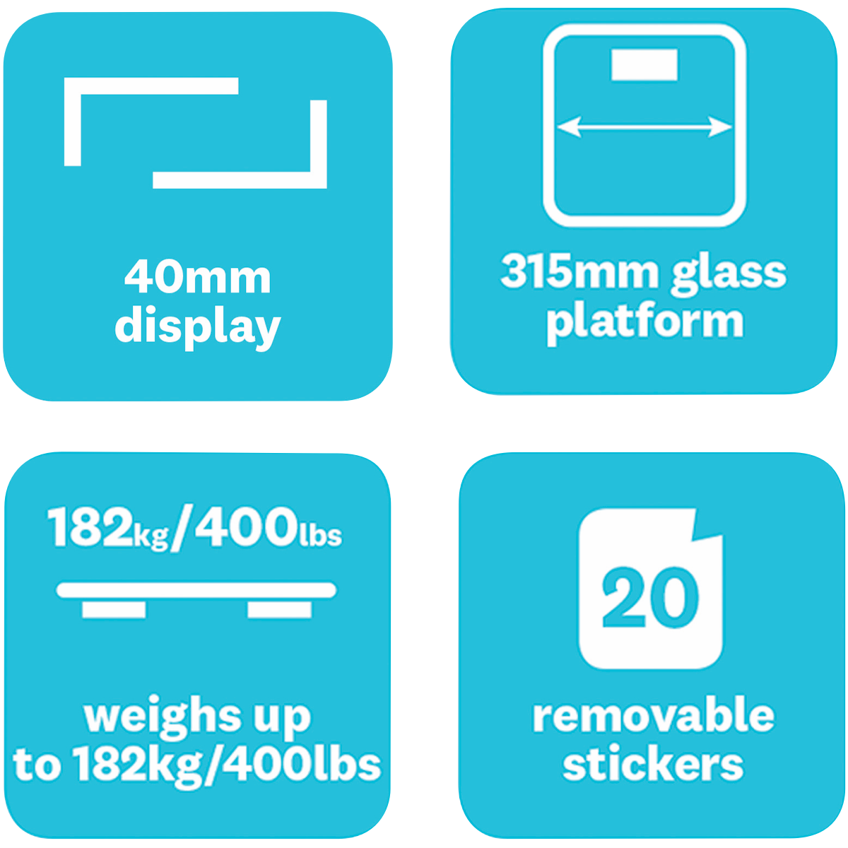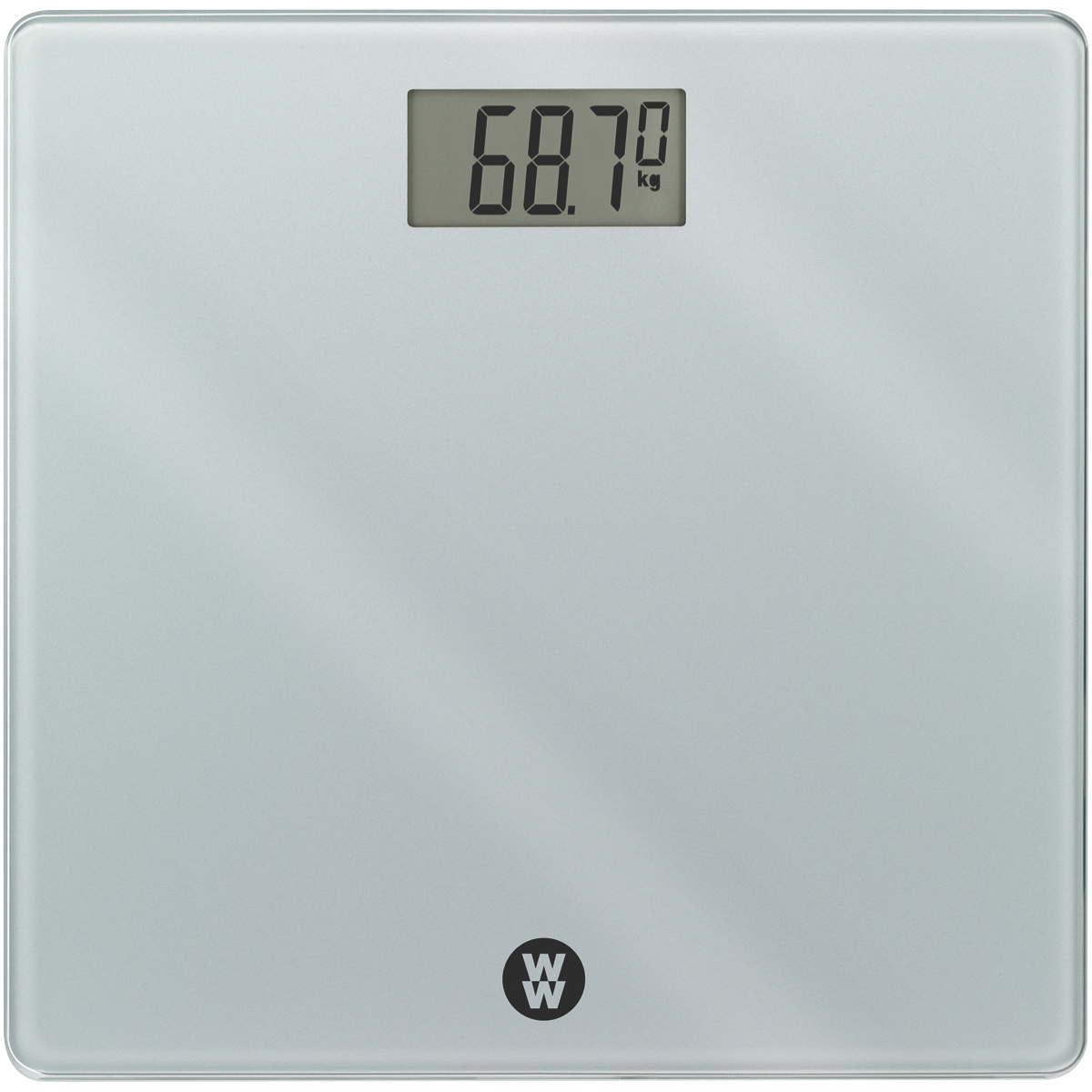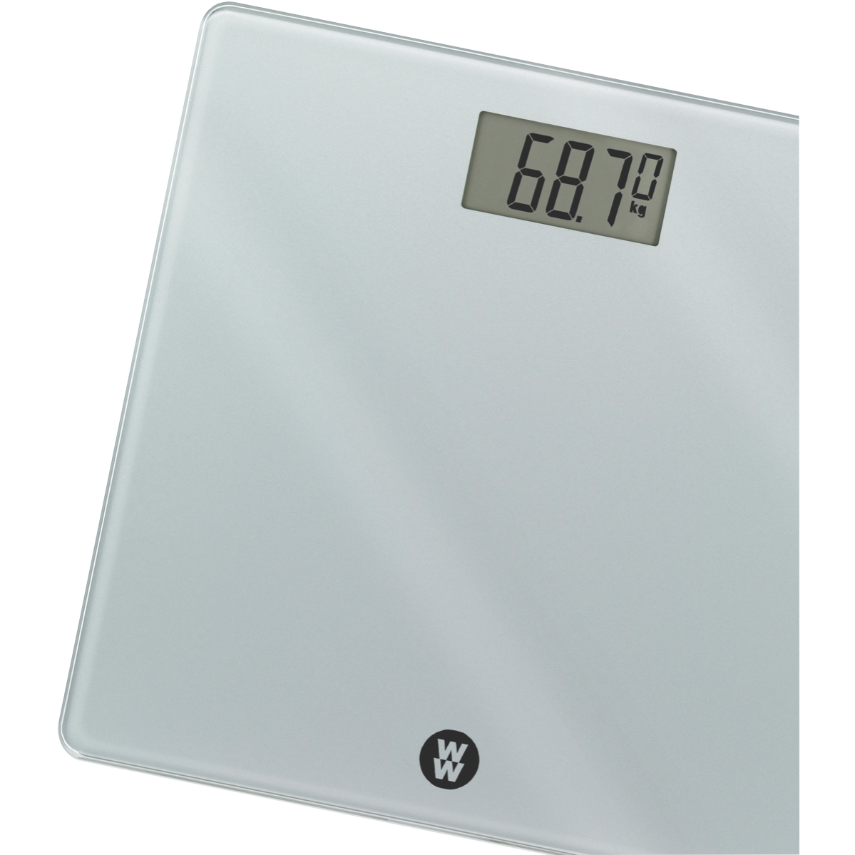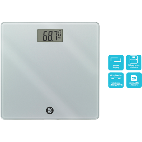 Step onto the sleek silver WW Body Weight Scale to effortlessly track your fitness journey. This bathroom scale features a durable tempered glass construction with a generous 182kg weight capacity so it can accommodate users of all sizes. The scale's high visibility 3.8cm digital readout ensures easy viewing of precise weight measurements in kilograms or pounds. Long-life lithium batteries are included with the scale so you can start using it right out of the box. The WW Body Weight Scale's smooth glass surface wipes clean easily and blends seamlessly into any bathroom décor. With a 10 year manufacturer's warranty this digital scale is built to last. Regular weigh-ins on the WW Body Weight Scale can help you stay on track with diet and exercise goals for improved health and wellbeing over time. The manufacturer's part number for this product is WW58CA. Check out the WW Body Weight Scale to monitor your weight goals effortlessly.